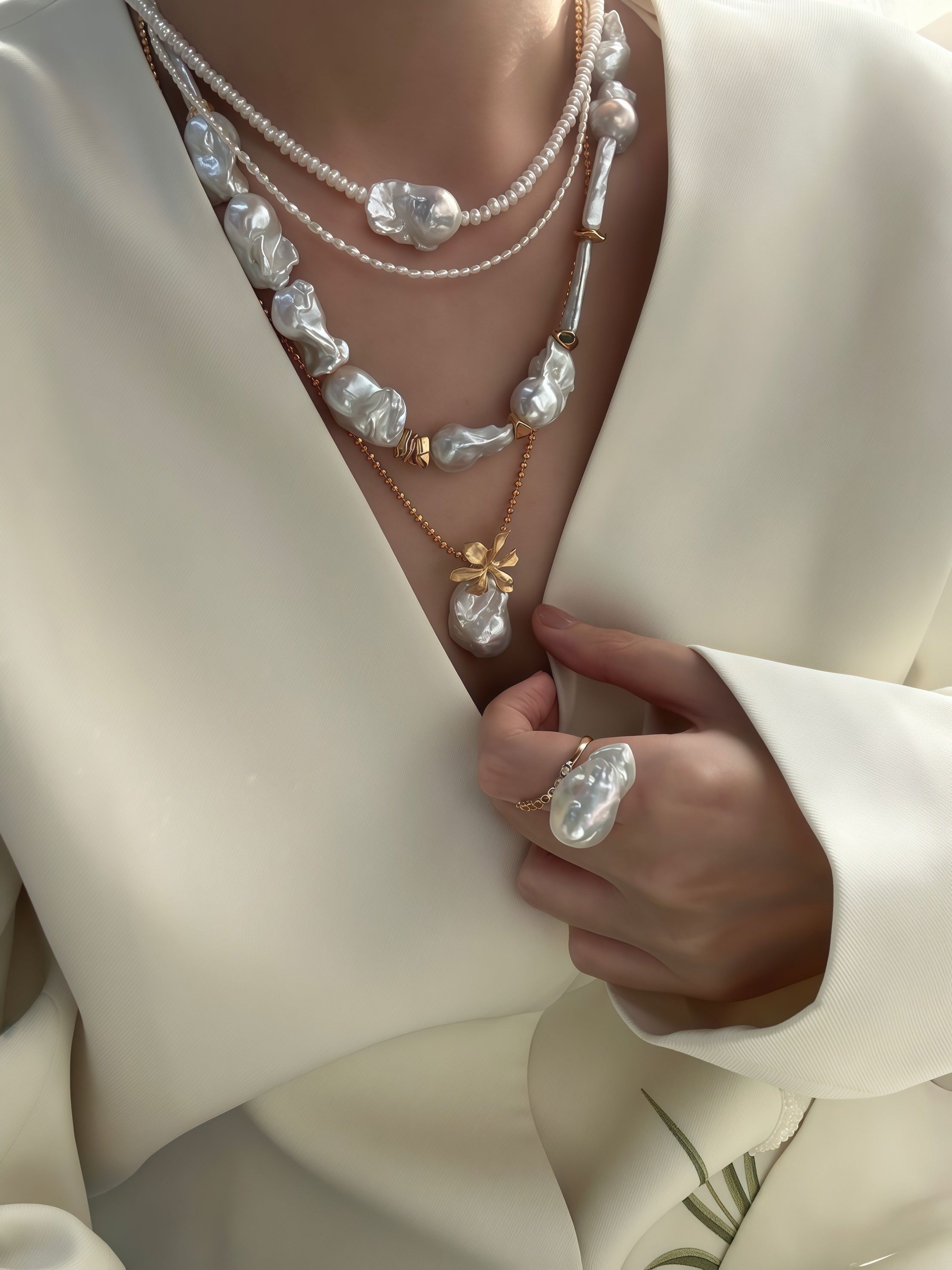 925 Silver Amber Natural Freshwater Double-Baroque Pearl Necklace Chain Length 43 cm Square Clasp